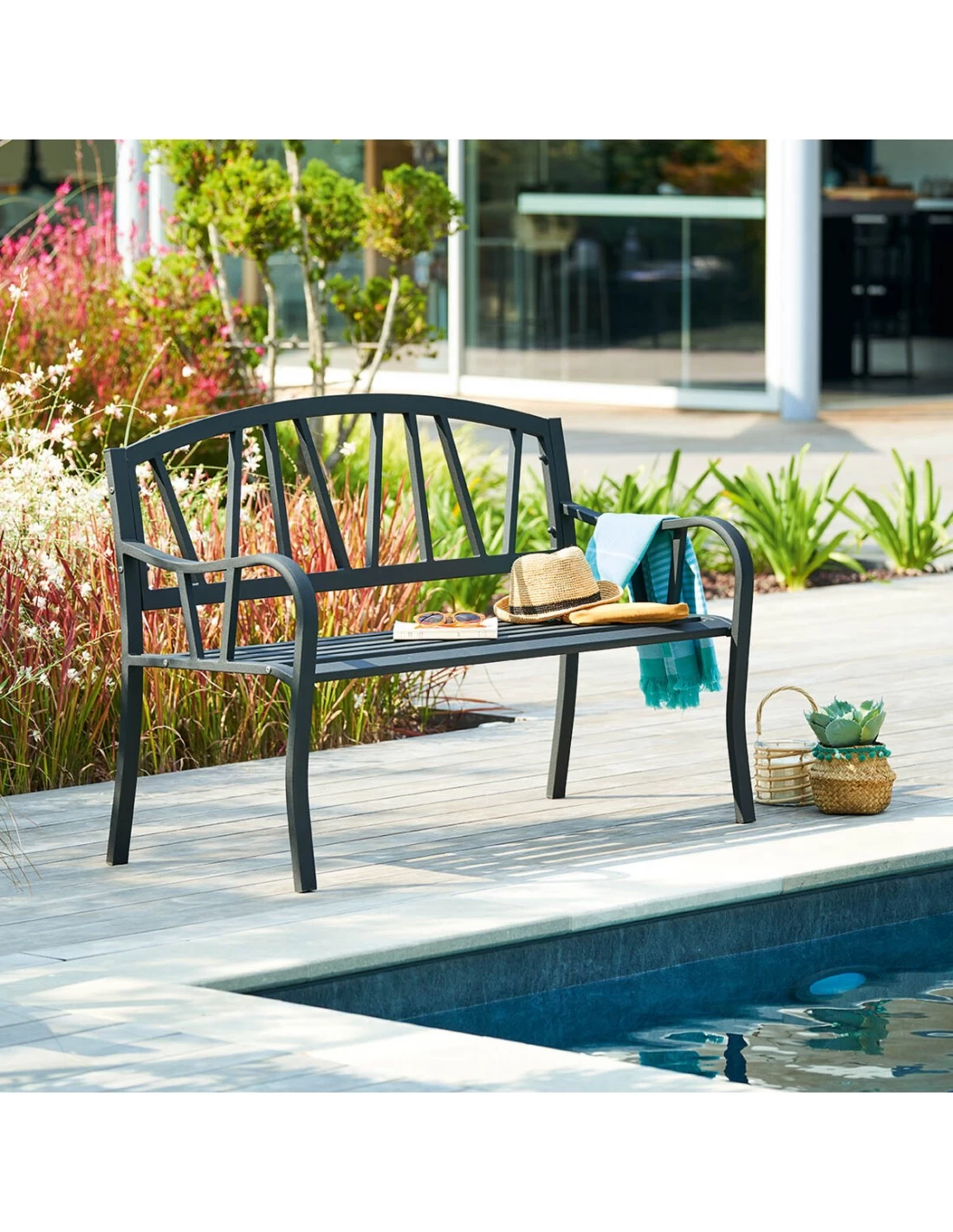 Banc de jardin 3 places en acier époxy noir et au design moderne et à petit prix !