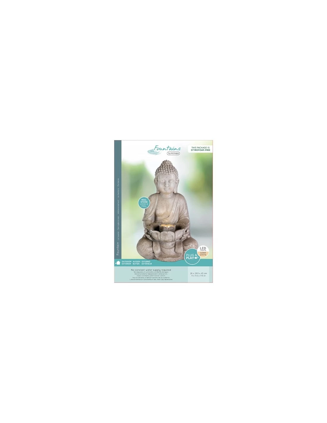 Fontaine bouddha avec lumière LED blanc chaud pour créer une ambiance apaisante au jardin.