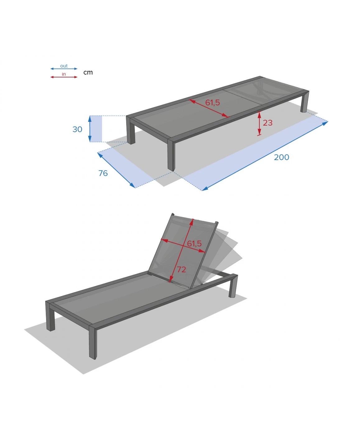 - Structure traité Époxy Anti-rouille Dossier inclinable 5 positions Position 100% allongée pour un confort optimal Facile à déplacer