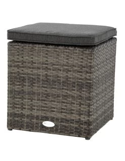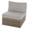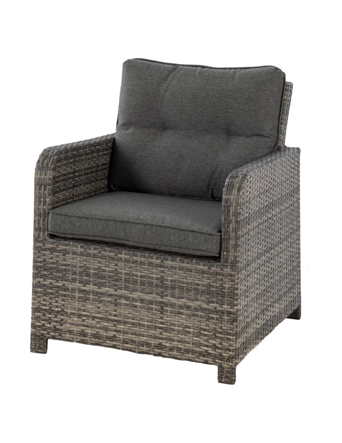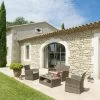 Salon de jardin en résine tressée, composé d’une banquette 3 places, 2 fauteuils, 2 poufs, une table haute, et des coussins épais !